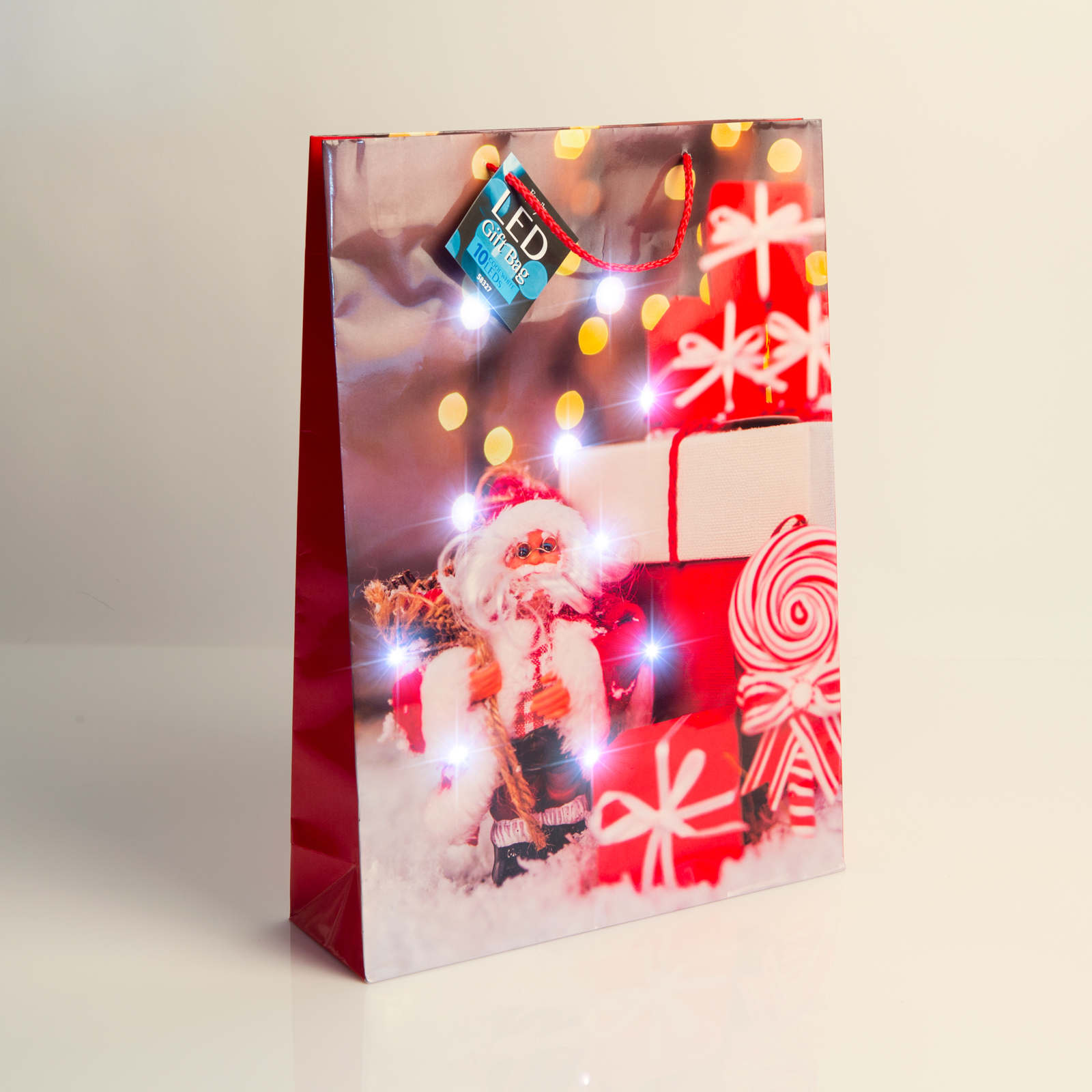 Az ajándéktasak oldalát különleges minta díszíti és kiváló minőségű papírból készült, hogy hosszútávon is tökéletesen szolgáljon. A tasakon elhelyezett LED-ek különleges hangulatot teremtenek, melyek energiájáról a beépített elemek gondoskodnak.